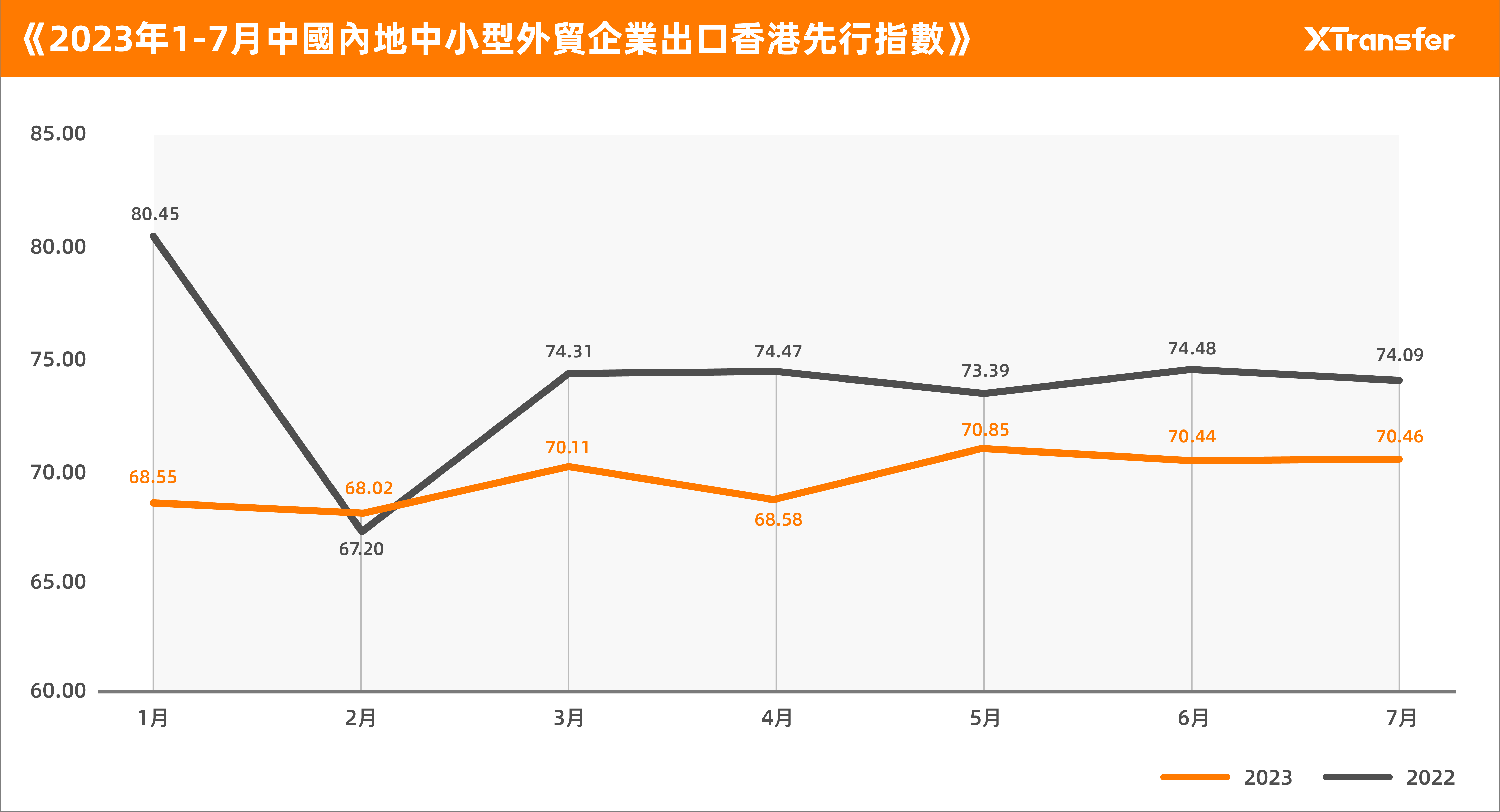 另外,會上XTransfer非常興奮首次公佈「2023年1至7月中國內地中小型外貿企業出口香港先行指數」。指數是由2023年及往年同期具有代表性的同批客戶樣本數據,結合XTransfer平台中小型外貿企業收款表現,進行歸一化處理後加權計算得出。在 B2B 出口貿易中,收款數據往往先行於海關數據和物流數據顯現趨勢,可以預測未來1至3個月的外貿出口情况。2023年1至7月先行指數整體表現雖低於去年同期,但呈現穩中有升的態勢。XTransfer預計,8月先行指數將提升至70.53。