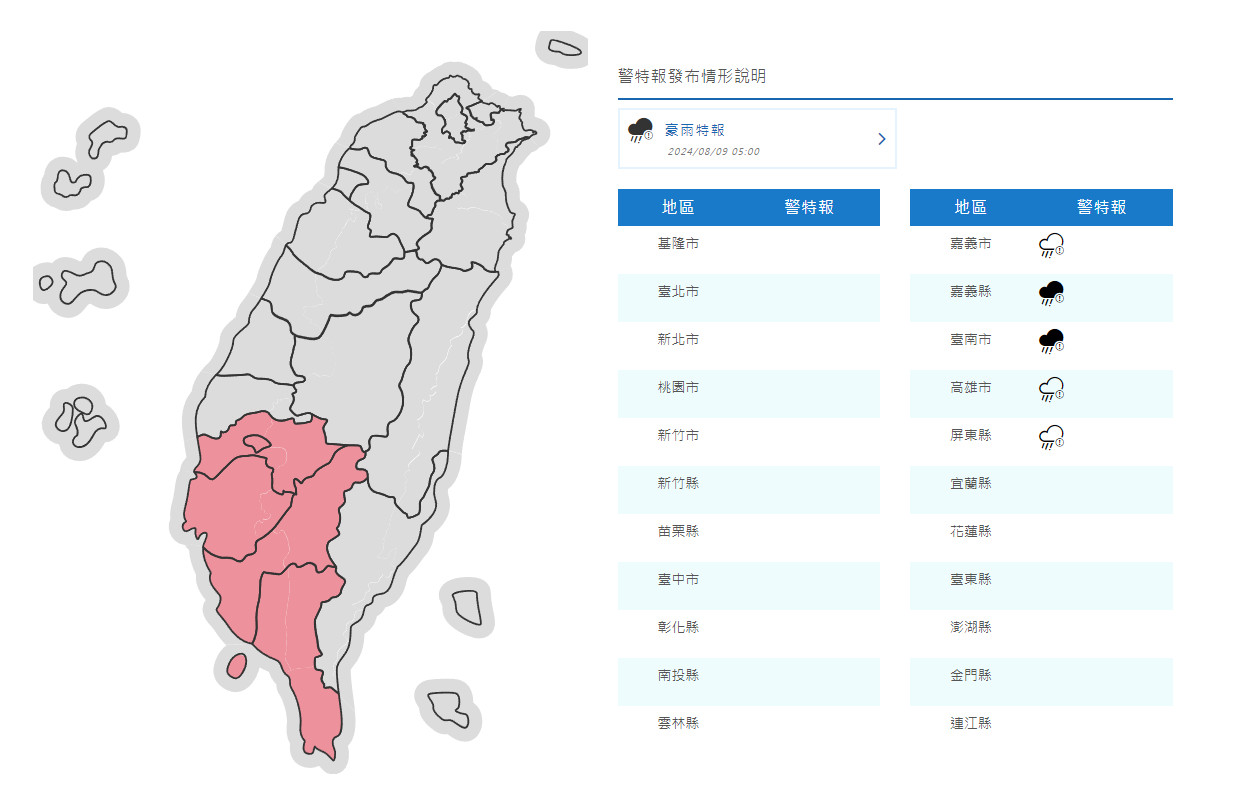 今晨5點,氣象署針對嘉義、台南發佈豪雨特報。(圖/中央氣象署提供)