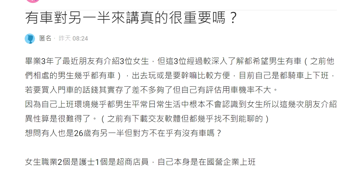 一名26歲的男網友,在Dcard上發文分享,最近透過朋友介紹,認識3位女性,分別是2位護理師、1位超商店員,但在交往條件上,這3位女性都說「要有一部轎車」,表示「過去的交往對象幾乎都有車,有車會讓出遊或日常生活更加便利」。