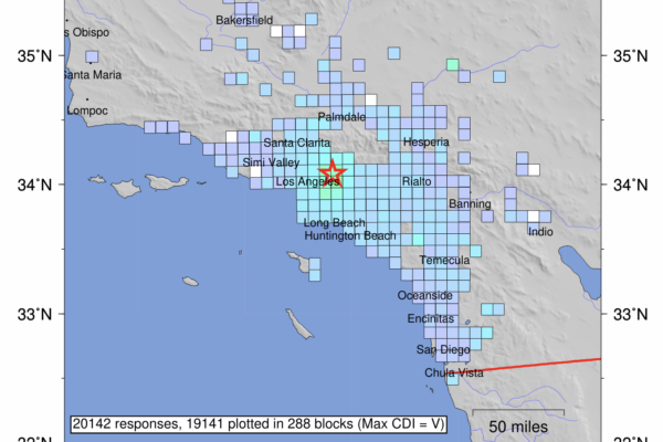 震央位於洛杉磯市中心附近。(圖/美國地質調查局)