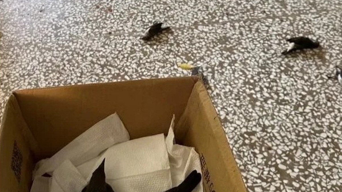 走廊上有十餘隻鳥撞窗死亡。(圖/東森新聞)