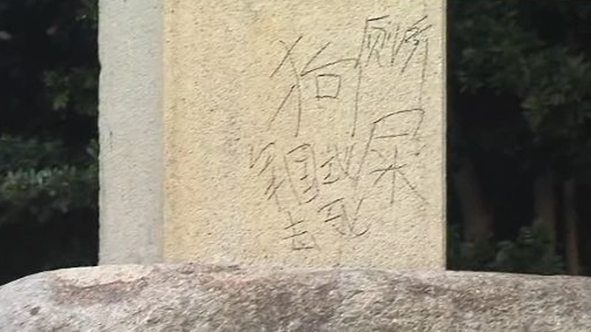 大大的「廁所」簡體字,一旁還有不少不雅字眼,日本靖國神社又遭人破壞。朝日電視台主播:「19日凌晨4點前,東京千代田區靖國神社,工作人員撥打110報警,表示石柱上有塗鴉。」