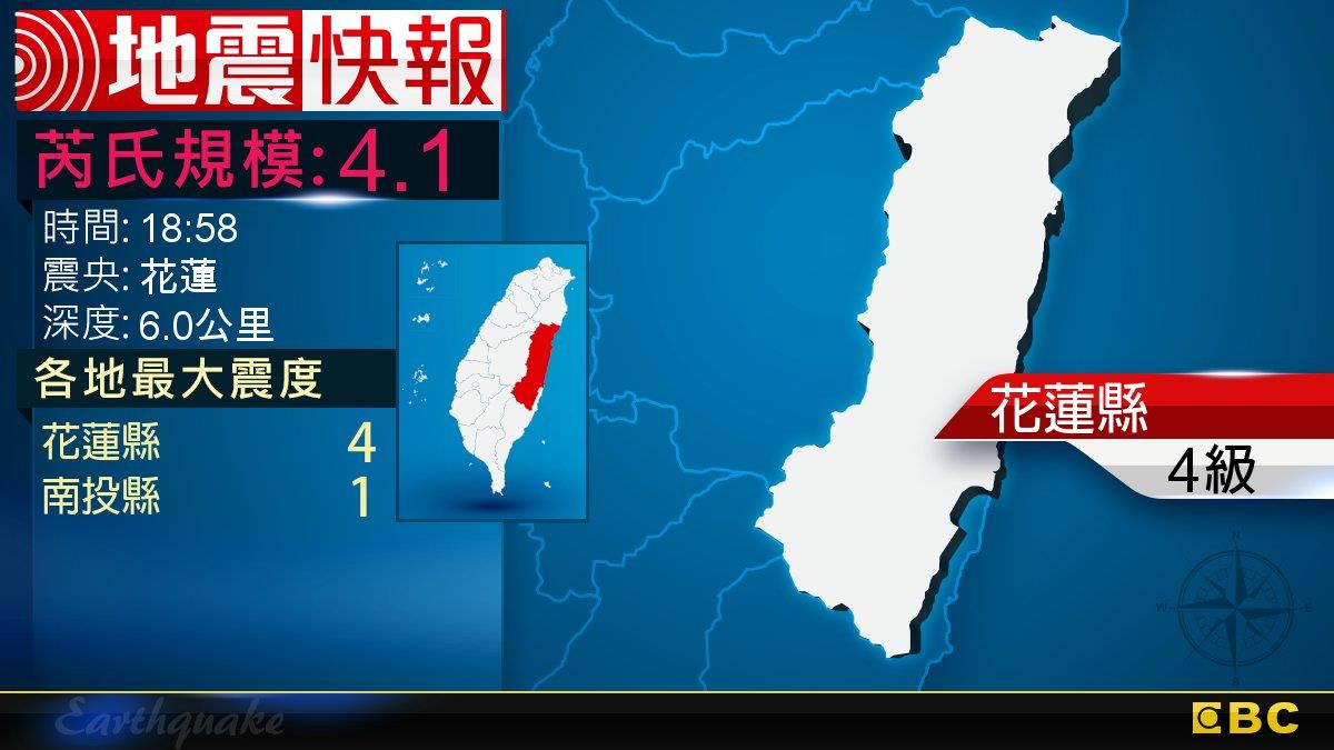 中央氣象署發布顯著有感地震最新消息,今(18)日18時58分,發生芮氏規模4.1有感地震,震央位置在花蓮縣政府南方 29.8 公里 (位於花蓮縣近海),震源深度6.0公里。