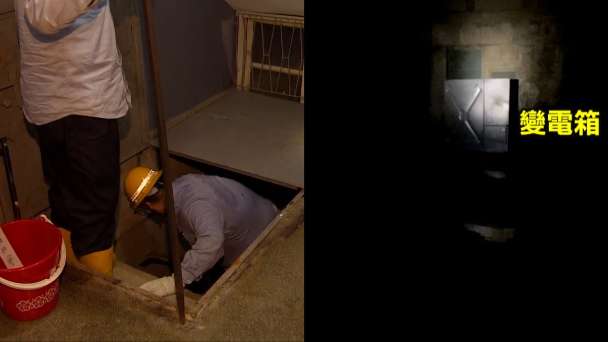 公寓地下室嚴重積水,台電人員打開印有台電2大字的厚重鐵門,整個地下室水淹到腳踝,水面上 還浮著一層疑似白色泡沫的東西,而最裡面竟然是變電箱,像是湖中島,明顯有公安危機,鄰居卻 互踢皮球。