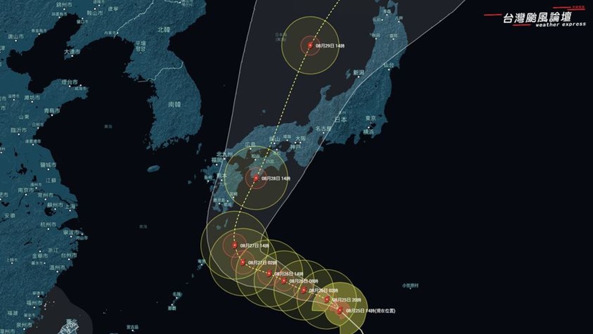 臉書《台灣颱風論壇|天氣特急》說明「珊珊已經增強為中度颱風,將沿著太平洋高壓邊緣往西再北轉,路徑略有西修,預計在週二開始率先影響九州地區,週三將登陸四國、穿越岡山或京阪,週四進入日本海,逐漸減弱。」