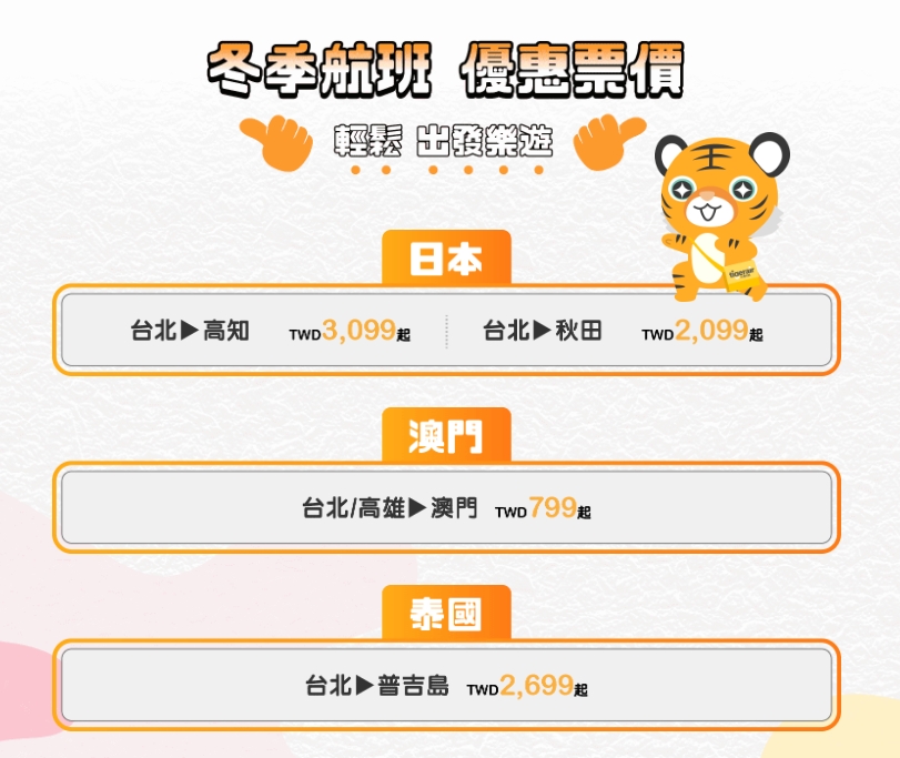 台灣虎航推出「冬季航班」優惠,航線單程票價799元起。(圖/翻攝自台灣虎航臉書)