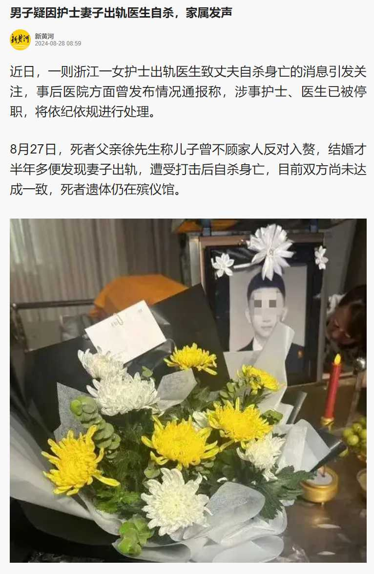 大陸浙江一名從事金融業的25歲男子,為了愛入贅,沒想到結婚才半年,男子竟發現護士妻出軌同院的醫師,遭受打擊的他絕望身亡,目前雙方尚未達成一致,死者遺體仍擺在殯儀館內。
