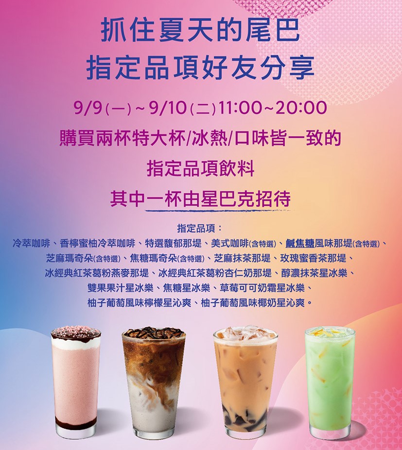 這次星巴克「指定品項好友分享日」限定9/9~9/10共2天,在活動期間11:00-20:00,至全台星巴克門市購買兩杯特大杯冰熱、口味皆一致的指定飲料,其中一杯由星巴克招待,快揪同事一起開喝。