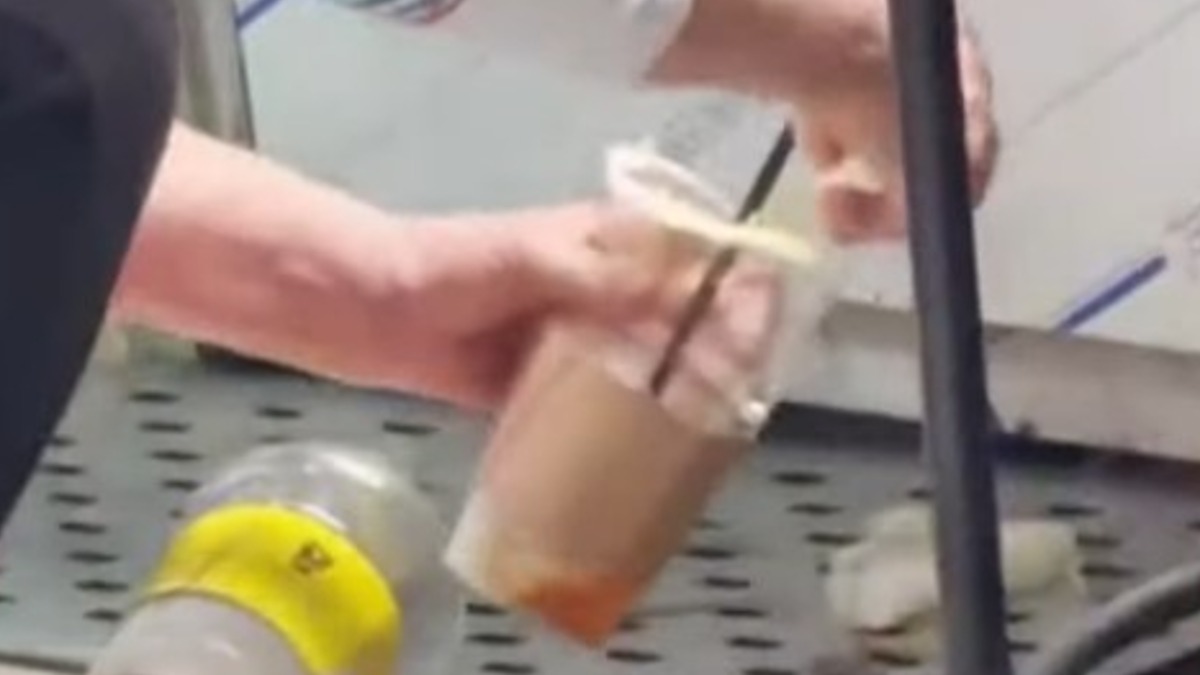 穿著紅色上衣的婦人,從垃圾桶裡拿起民眾丟掉的冰飲料杯,先是丟在魚攤前的排水孔,接著又回頭把散落一地的冰塊放進藍色小水瓢,全都倒在新鮮魚貨上。韓國網民將婦人用垃圾冰塊來冰魚的影片放上網,直說實在太不衛生了。