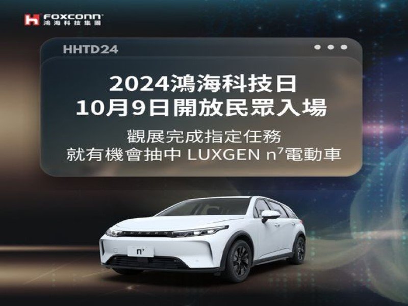 2024鴻海科技日即將於10月8、9日隆重登場,鴻海表示,今年是集團50週年,也是鴻海科技日舉辦的第5年,為感謝大眾的支持,集團將於10月9日活動最後進行抽獎活動,只要當日完成觀展的指定任務,就有機會抽中最大獎「Luxgen n⁷電動車一台」,把電動車開回家!