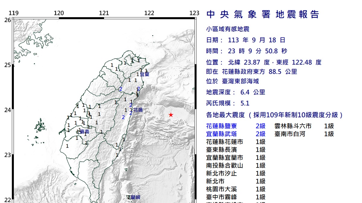 中央氣象署地震報告指出,今(18)日23點09分在北緯23.87度,東經122.48度發生規模6.4地震,深度6.4公里,震央位於花蓮縣政府東方88.5公里,位於臺灣東部海域,最大震度2級。