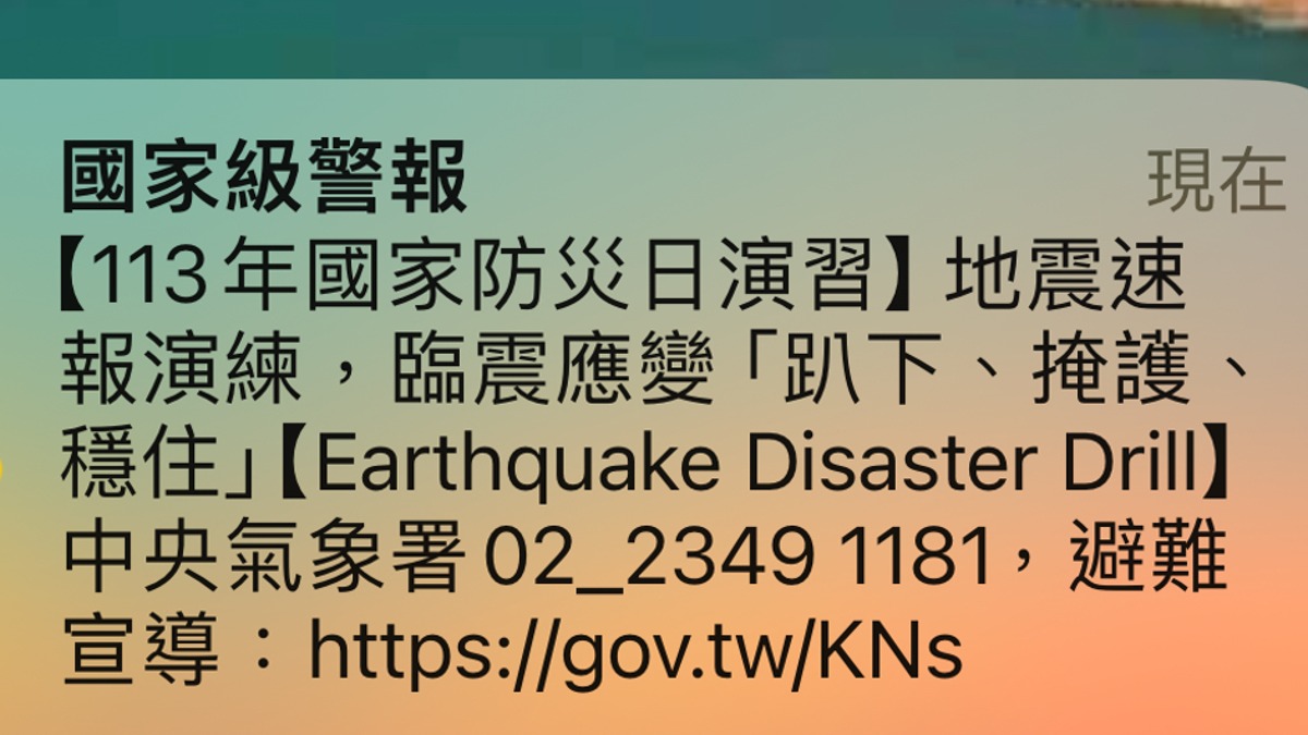為配合國家防災日演練,中央氣象署今(20日)在早上9點21分及10點,分別發布「地震」和「海嘯」情境的全國性警報演練訊息,提醒民眾收到訊息勿驚慌。許多民眾在9點21分收到災防告警細胞廣播服務(Cell Broadcast Service,CBS)時,雖難免有些嚇到,但大多都很冷靜,沒有受到驚嚇。而在上班路上的民眾,有的人會停下看一下手機,但看完後就繼續前往上班路上。