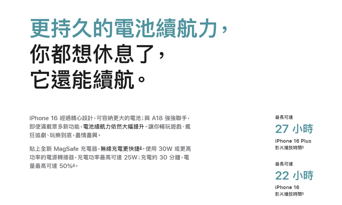 iPhone 16系列的電池續航力有所提升。(圖/翻攝自蘋果官網)