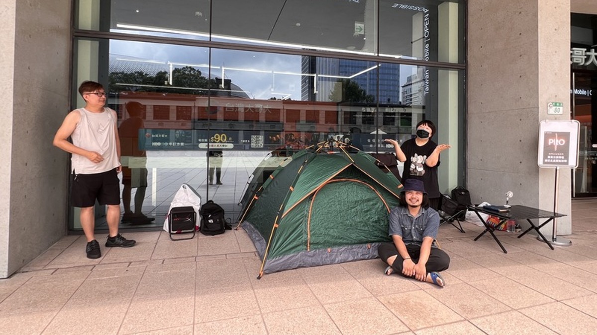 民眾為了搶iPhone 16,台灣大哥大門市已出現「頭香哥」,從18日晚間就在電信門市外搭帳棚。(圖/中央社)