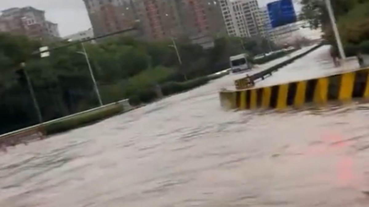 民眾從高處往下拍攝,可以看到,馬路幾乎已經成了河道,水深達半個輪胎高,當汽機車經過時,帶起了陣陣波浪,幾乎可以用陸上行舟來形容,不少車子,也因為進入,在路中拋錨等待救援,「葡萄桑」颱風在19日晚間,在上海市登陸帶來驚人雨量,614個測站中,225個達到暴雨程度。