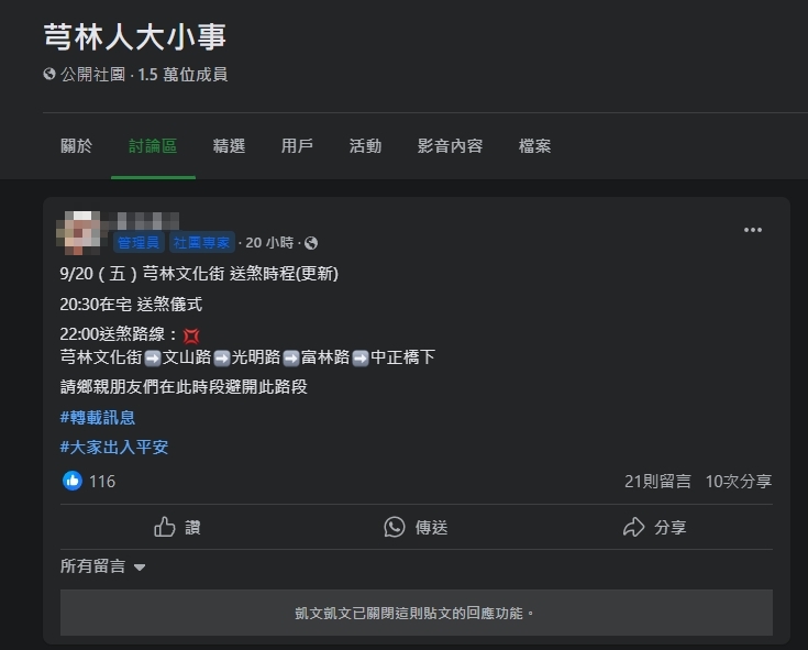 臉書社團「芎林人大小事」管理員指出,今日晚間芎林文化街將舉行送煞儀式,20點30分先在家中舉行,22點由家中送出,路線將會從芎林文化街左轉上文山路,走道分岔路口接光明路,接著到大路口在轉富林路,最後在右轉往中正橋下,管理員也特意提醒民眾避開路段,祈求大家出入平安。