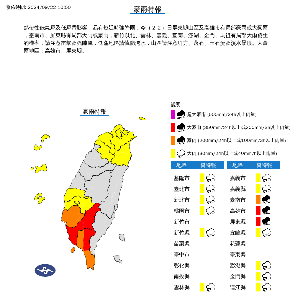 中央氣象署指出,熱帶性低氣壓及低壓帶影響,易有短延時強降雨,今(22)日屏東縣山區及高雄市有局部豪雨或大豪雨,臺南市、屏東縣有局部大雨或豪雨,新竹以北、雲林、嘉義、宜蘭、澎湖、金門、馬祖有局部大雨發生的機率,請注意雷擊及強陣風,低窪地區請慎防淹水,山區請注意坍方、落石、土石流及溪水暴漲。大豪雨地區:高雄市、屏東縣。