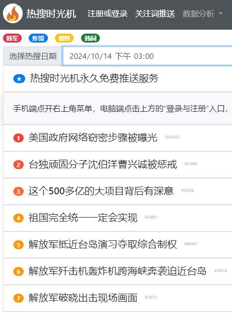 微博熱搜時光機,14日前50大熱搜話題,出現大量圍台軍演討論。(圖/翻攝自微博熱搜時光機)