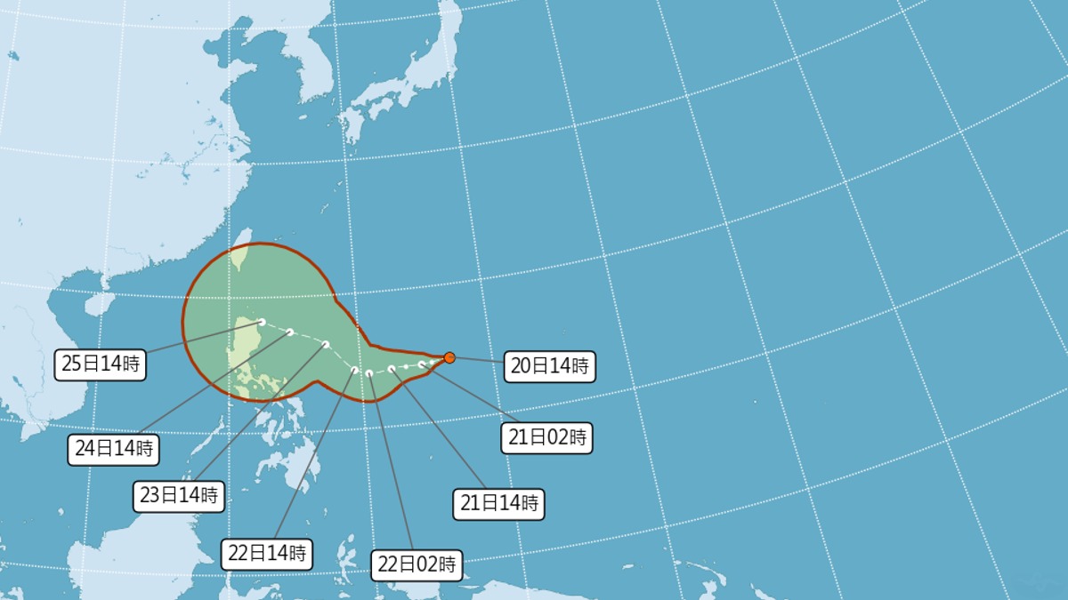 位於菲律賓東方海面的熱帶擾動,在今(20)日下午2時發展為熱帶低壓。(圖/中央氣象署)