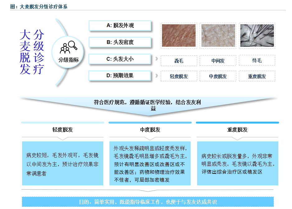 大麥脫髮分級診療體系主要根據發友脫髮量和脫髮程度,將脫髮情況分為輕、中、重度:輕度脫髮是指早期脫髮量不多,脫髮程度輕,照片有頭髮微微減少,毛髮鏡指標有變化。治療以藥物、居家養護、食療為主;中度脫髮是指照片頭髮減少,毛髮鏡指標變化明顯。治療以養固(低能量鐳射、富血小板血漿、中胚層治療等)為主;重度脫髮是指頭發明顯減少或禿發,影響外觀,治療以毛髮移植手術為主。