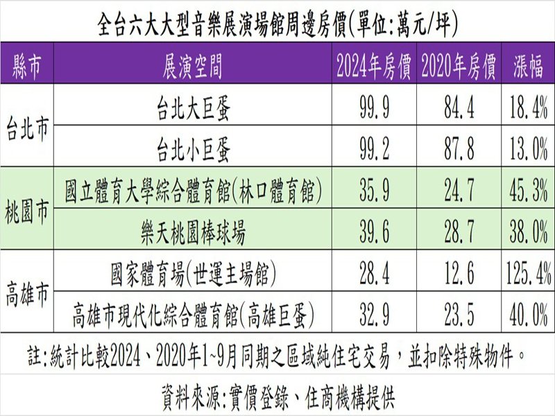 全台六大大型音樂展演場館周邊房價。(住商機構提供)