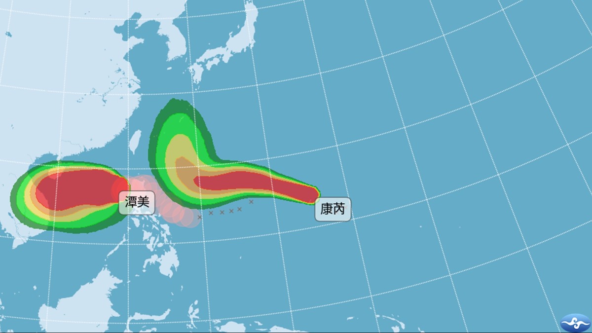 雙颱共舞!颱風「潭美」、「康芮」接連形成,氣象署示警,今(25)日受颱風外圍環流的影響,基隆北海岸、宜蘭縣及臺北市、新北市的山區,仍可能出現局部大雨或豪雨。此外,花蓮、臺東地區及恆春半島、蘭嶼、綠島,也有發生局部大雨的機率。至於「康芮」是否撲台,各國預測路徑也曝光了。