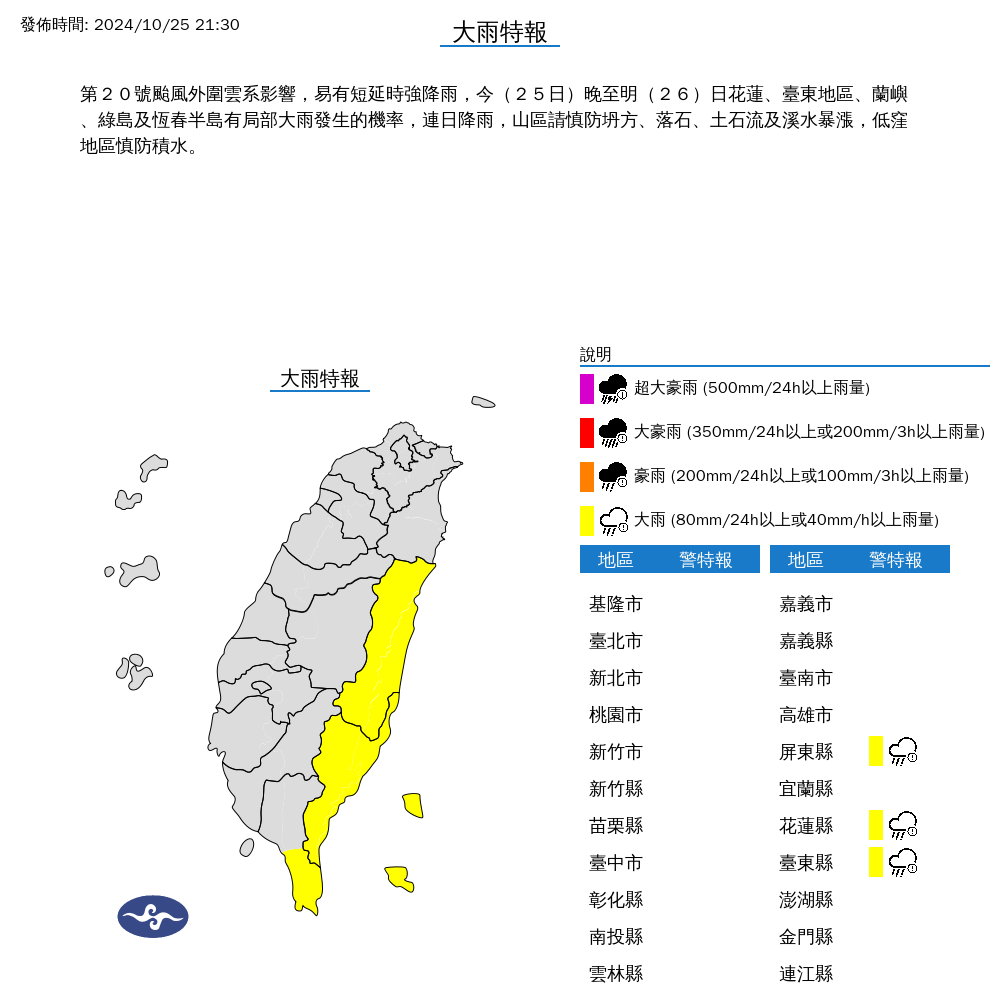 中央氣象署25日21:30針對3縣市發布大雨特報,包括花蓮、台東與恆春半島,都會有大雨等級雨量,預計會一路下到26日凌晨。