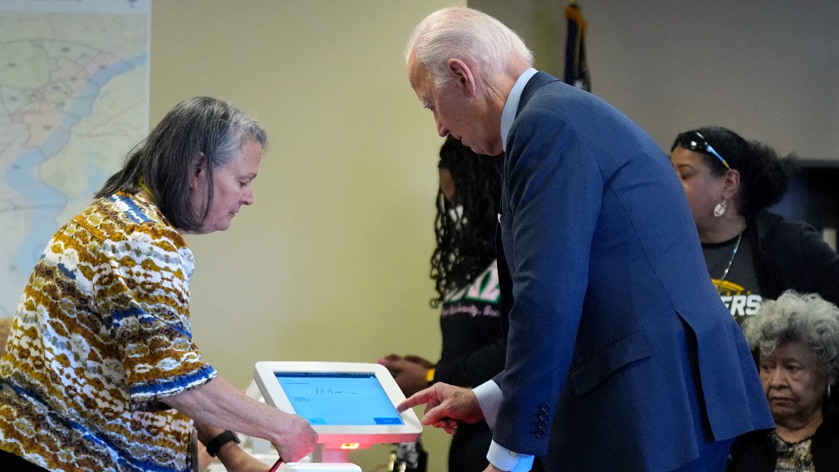 拜登總統在投票站簽名,為 2024 年大選投提前投票。(圖/美聯社)