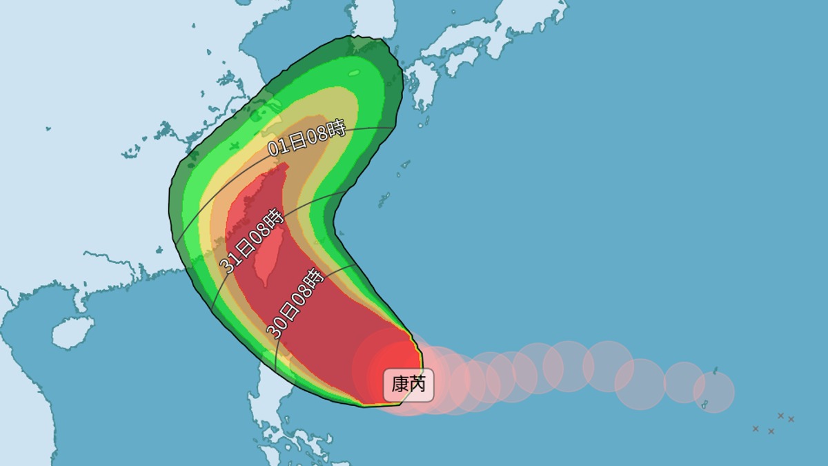 康芮於今日凌晨發展成中颱,不排除強度還會再增強,根據氣象署早上8點統計,全台除金門縣外,共21縣市暴風侵襲率在90%以上。氣象專家賈新興預估,後天(31日)首當其衝的宜蘭、花蓮、台東、屏東4縣市放假機率高。