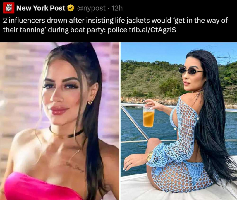 想拍攝網美照,結果卻成了「亡美」!巴西兩名網紅因為擔心拍照不好看又妨礙曬太陽,居然拒絕搭船時穿救生衣,結果快艇在波濤海浪中意外翻船,兩人雙雙溺斃。