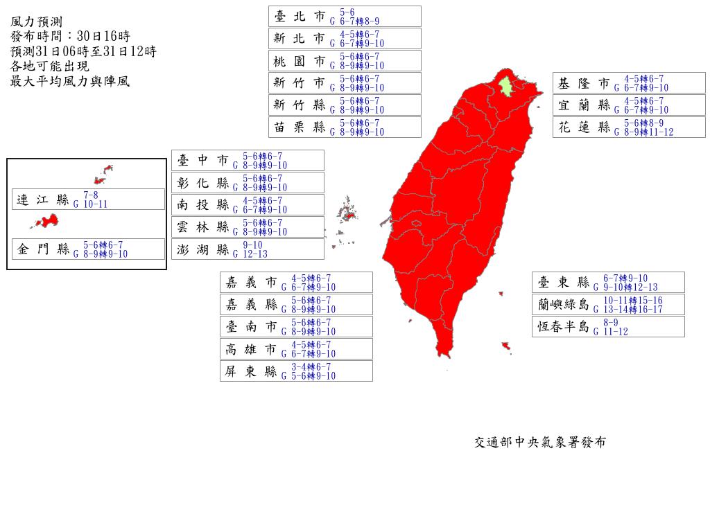 強颱康芮直衝台灣,依據氣象署30日下午16時觀測資料,明(31)天全台21縣市有望放颱風假,不過是否停班課,仍由當地政府決定。