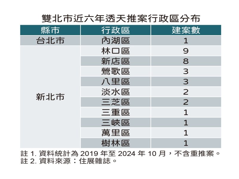 近6年來雙北市共計32案新推透天厝,只有一案位於台北市,坐落內湖區碧湖公園周邊別墅區,其餘都在新北市,要在寸土寸金的台北市推透天案,顯然不具效益。而新北市則以林口區、新店區各有9筆與8筆的透天案為多,大都分布在新店區的華城特區,與林口區康橋國際學校一帶,皆為區域知名的透天別墅聚落。