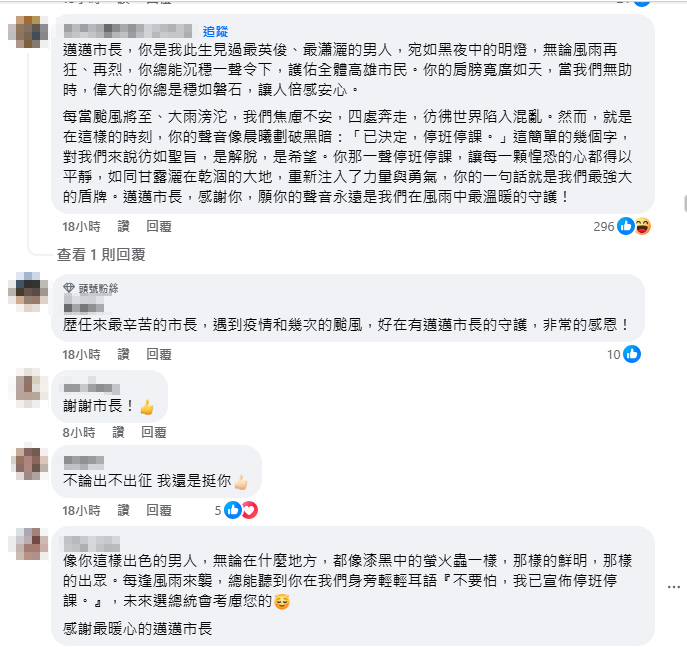 強烈颱風來勢洶洶,暴風圈已接觸臺灣陸地,全台今(31)日停班停課1天。其中高雄市加上這次康芮的颱風假,10月總共放了五天颱風假。陳其邁的臉書再度被灌爆,有網友表示「這次又要連放幾天?」,也有網友直喊「你是我見過最英俊、最瀟灑的男人」、「市長我愛你!」