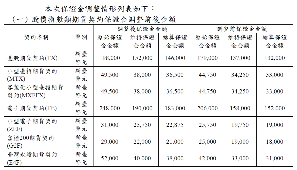 台灣期貨交易所今(30日)公告調整期貨保證金,俗稱「大台」的台指期原始保證金將調高至33.8萬元,「小台」則調漲至8萬4500元,自明(31日)一般交易時段結束後起實施,若遇休市將順延至次日一般交易時段結束後起實施。