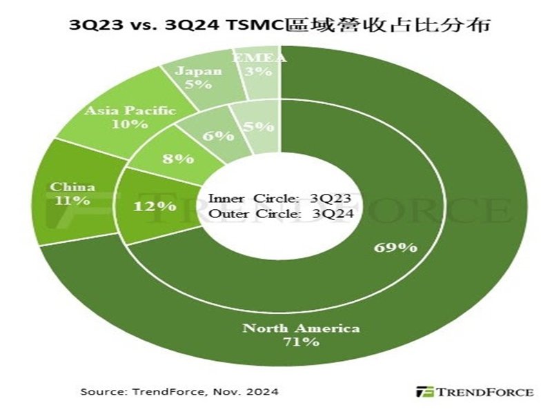 從區域營收佔比分析,TSMC 2023全年和2024年前三季來自中國的營收占比穩定在11%至13%。若本次先進製程審查擴大或有客戶遭列入實體清單,影響中國AI相關IC設計公司、IP公司,甚至第三方設計服務或其他在TSMC 先進製程開案、流片及量產生意,預估可能影響TSMC 整體5%至8%的營收表現,不容忽略。然而,由於全球AI晶片需求強勁,加上TSMC對先進製程客戶的漲價即將生效,可望能稀釋部分衝擊。