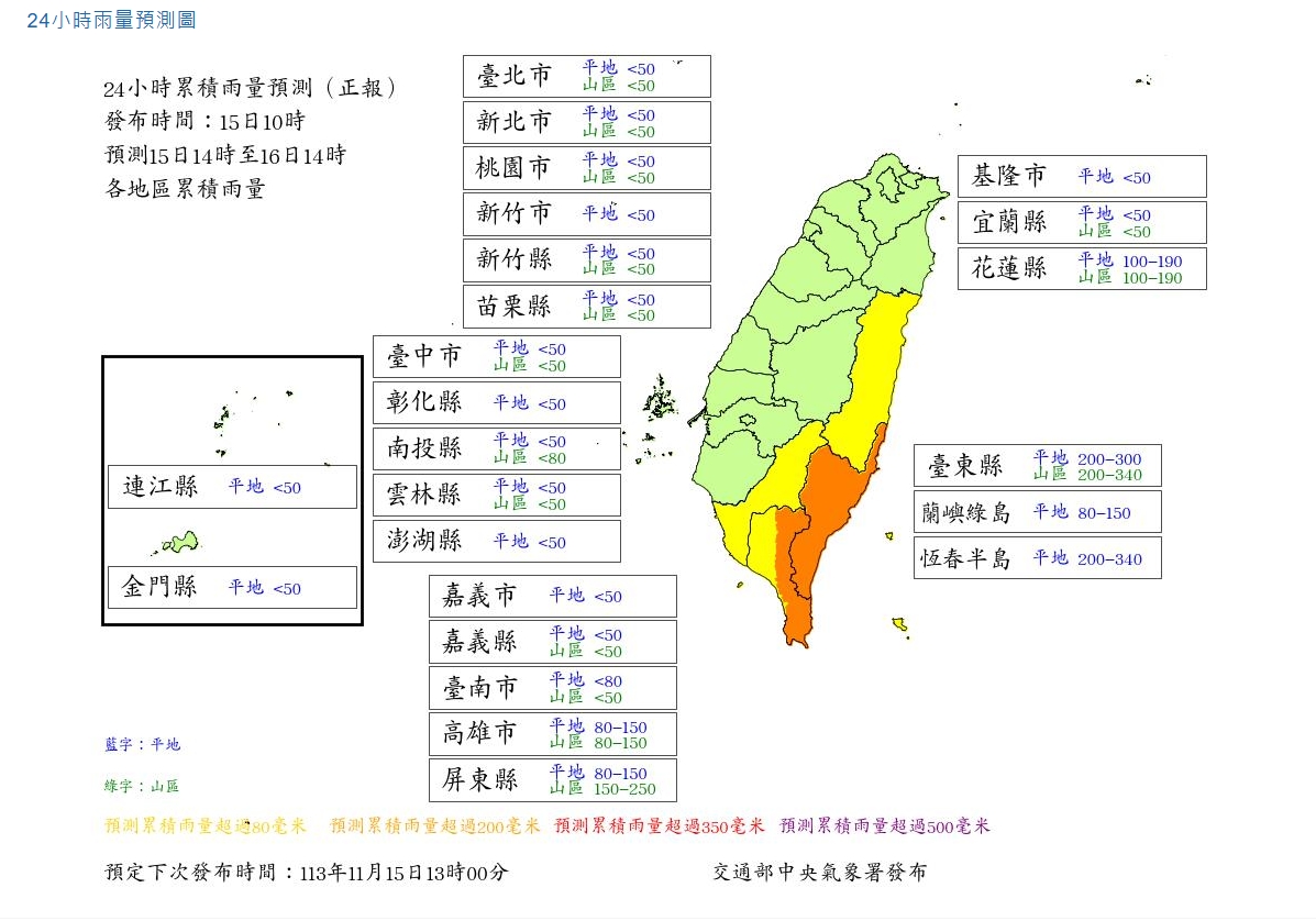 另依據氣象署15日上午10時公布的未來24小時雨量預測、風力預測,屏東縣山區預估雨量達到150至250毫米、台東縣山區及恆春半島均達到200至340毫米。恆春半島今天18時至16日00時、16日00時至06時的風力預測,達到陣風8到9轉9到10、陣風9到10的風力。屏東及台東部份地區均符合停班課標準。