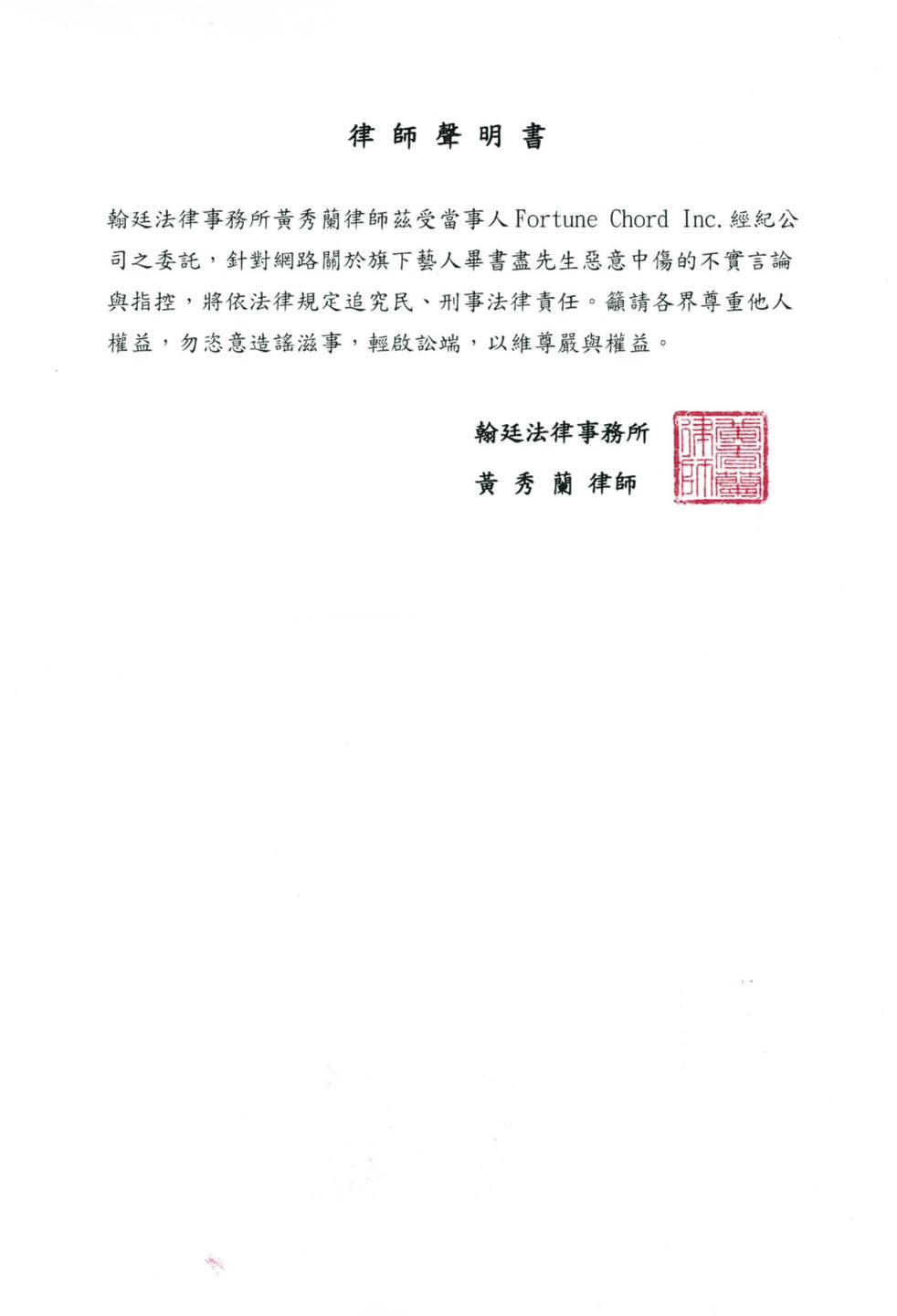畢書今(16日)發布律師聲明書。(圖/翻攝自臉書@Bii 畢書盡)