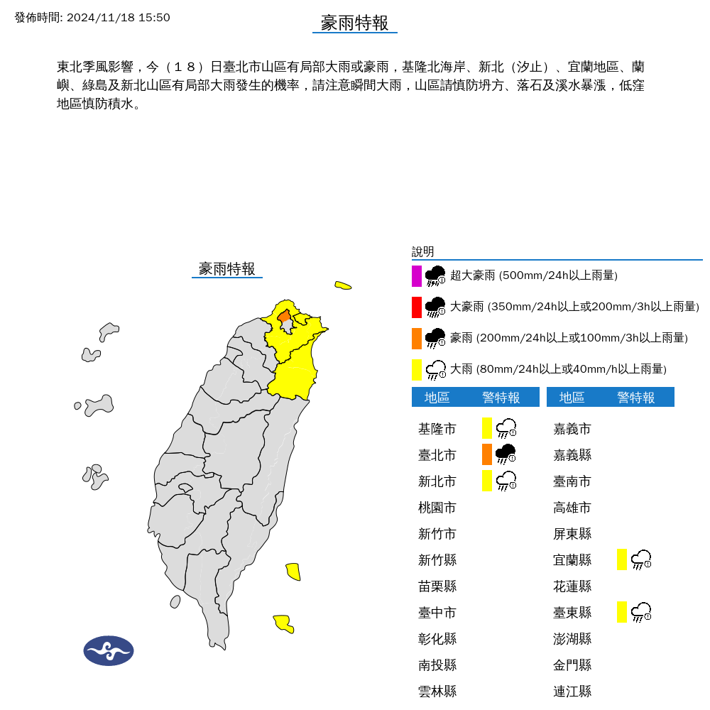 氣象署表示,東北季風影響,今(18)日台北市山區有局部大雨或豪雨,基隆北海岸、新北(汐止)、宜蘭地區、蘭嶼、綠島及新北山區有局部大雨發生的機率,請注意瞬間大雨,山區請慎防坍方、落石及溪水暴漲,低窪地區慎防積水。5縣市分別為:基隆市、台北市、新北市、宜蘭縣、台東縣。