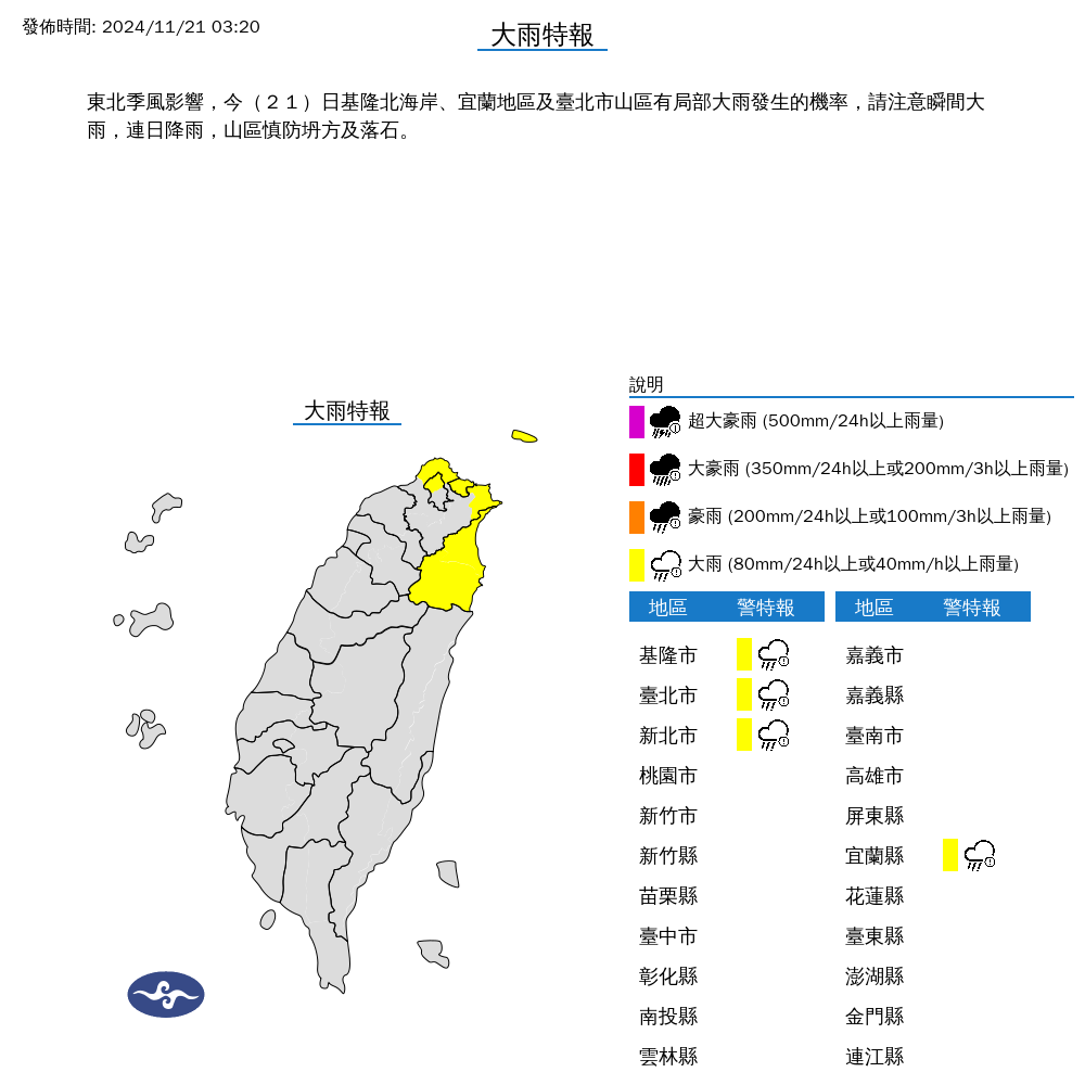 受到東北季風影響,氣象署指出,基隆北海岸、宜蘭地區及台北市山區有局部大雨發生的機率,請注意瞬間大雨,連日降雨,山區慎防坍方及落石,上班上課記得帶把傘以備不時之需。