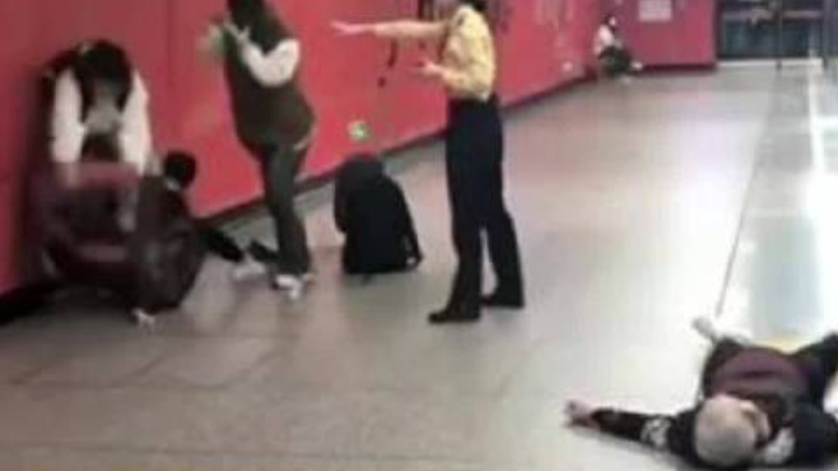地鐵候車月台上,兩名年輕人和兩名長者爆發衝突,雙方不斷拉扯扭打,年輕男子還出腳狠踹,站務人員趕緊勸架將人拉開,但可以看到還有另外一名老人家倒地不起,躺在月台邊。