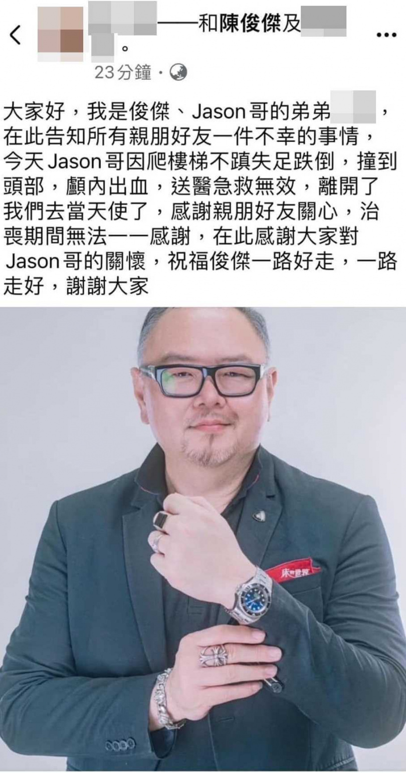 陳俊傑的弟弟陳三傑在臉書上發布消息,哥哥因為爬樓梯時失足跌倒、撞到頭部,導致出現顱內出血的症狀,送醫搶救仍不治身亡,「離開我們去當天使了」,已經與世長辭。