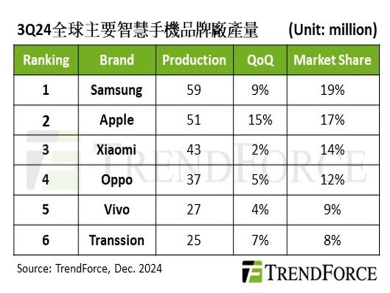 Apple第三季手機產量約5,100萬支,季增15 %,以近17%的市占率位居第二名。第四季Apple進入新機生產高峰,市占排名將躍升為全球第一。值得注意的是,其新機的AI話題未能在中國引起迴響,加上品牌競爭激烈,導致在當地的銷售表現較去年同期衰退。