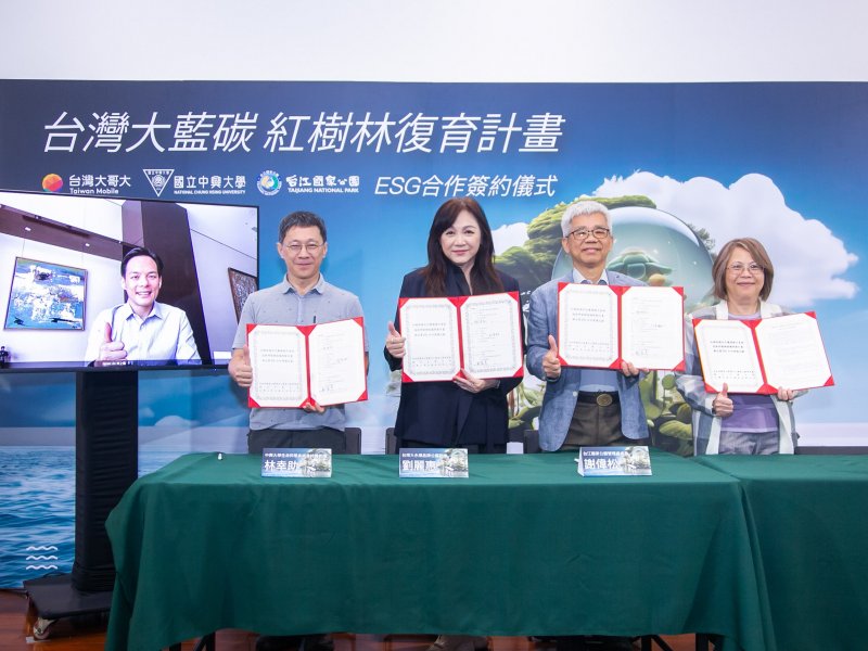 全球暖化日益嚴重,自然碳匯藉由吸碳固碳能力,成為全球淨零碳排的關鍵解方。台灣大哥大助力2050淨零碳排目標,今(5)日在國家公園署代理署長陳貞蓉、台灣大哥大總經理林之晨的見證下,由台江國家公園管理處處長謝偉松、中興大學生命科學系林幸助終身特聘教授,以及台灣大哥大永續品牌公關副總經理劉麗惠共同簽署「紅樹林複合式養殖模式負碳技術研發與碳權開發計畫」ESG合作備忘錄,產官學協力推動「台灣大藍碳紅樹林復育計畫」。