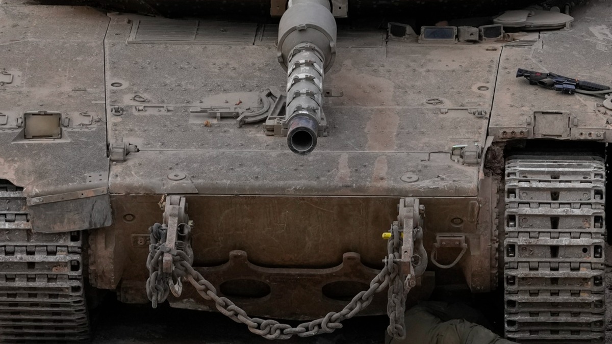 以色列士兵士兵在安全圍欄旁修理一輛坦克。(圖/美聯社)