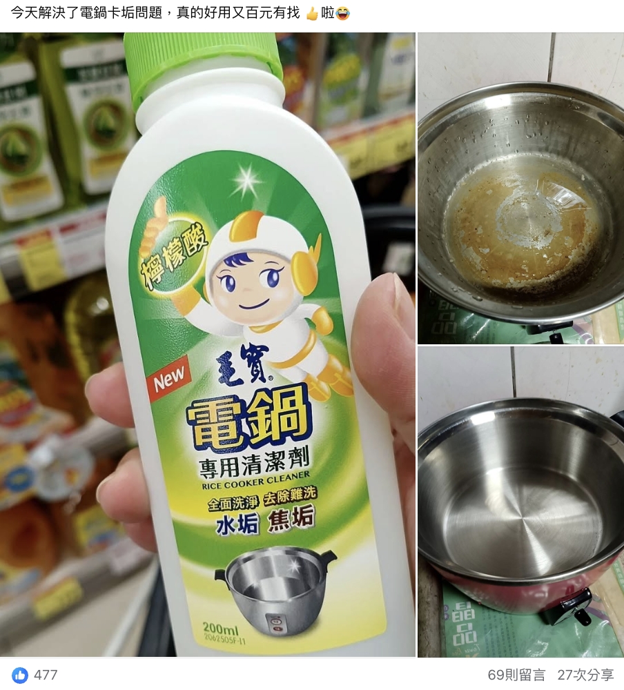不過也有網友分享更省錢的方法,「一般白醋加些水,下去煮熱後,等水溫降低,隨便刷刷就亮晶晶,真的不需要買」、「這太貴了,一般檸檬酸50-60/kg,便宜又好用」、「榨過汁的檸檬皮約2-3顆,放到電鍋水蓋過皮,約30分鐘即可,用絲瓜布抹一下就很乾淨」。