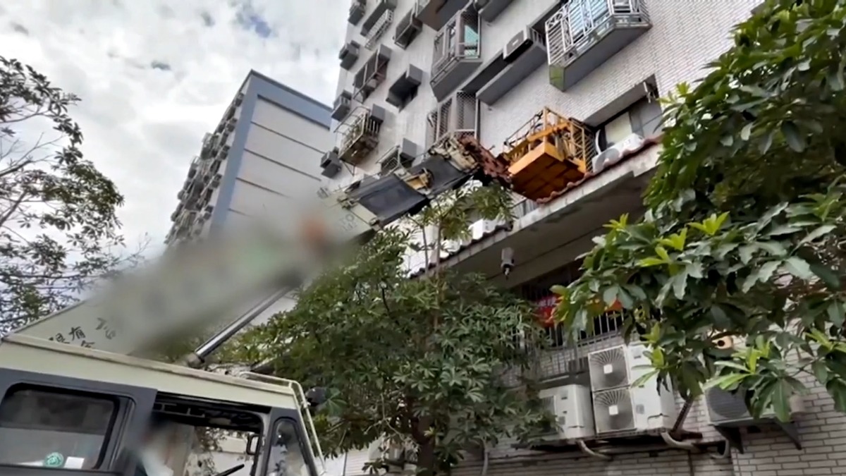 高雄有一名男子大門用鑰匙打不開,找來鎖匠也沒用,隔天找來吊車從窗台爬進去解鎖。(圖/東森新聞)