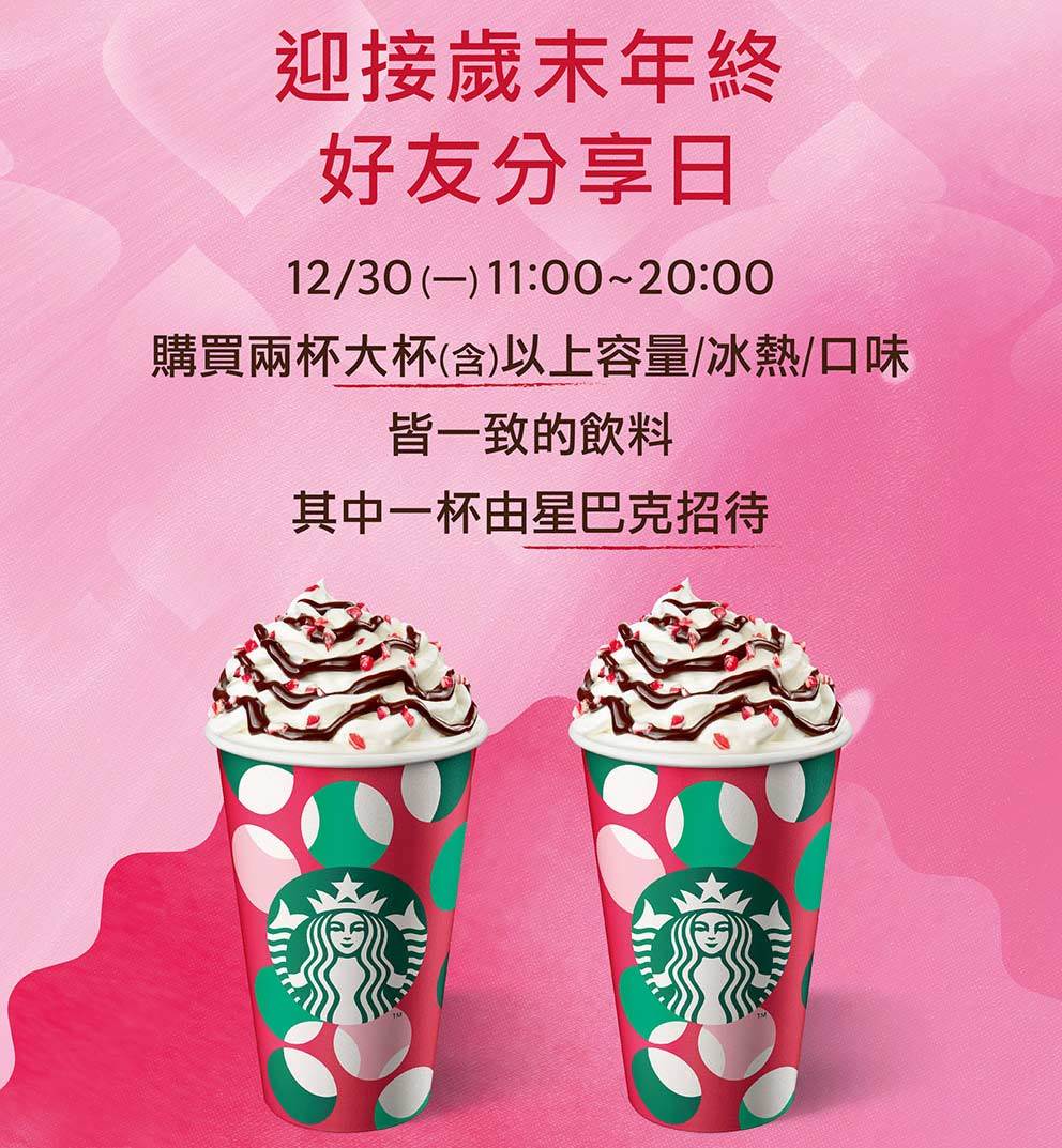 星巴克今(30日)推出限定一日「迎接歲末年終 好友分享日」活動,凡在上午11時至晚間8時內至星巴克門市購買2杯大杯(含)以上容量、冰熱、口味皆一致的飲料,其中一杯由星巴克招待,每人至多買二送二,限當場一次領取,詳細活動辦法依星巴克網站公告為主。