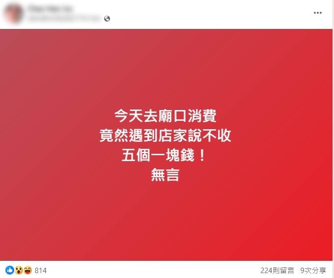 原Po在臉書社團「基隆人日常」透露,「今天去廟口消費,竟然遇到店家說不收5個1塊錢!無言」。其他網友也留言附和,「我今天在市場買了1顆蘿蔔22塊,我給25塊,老闆也不找回我3塊」、「很多攤販都不收1元」、「我上禮拜去,也有店家不收2張200元」。