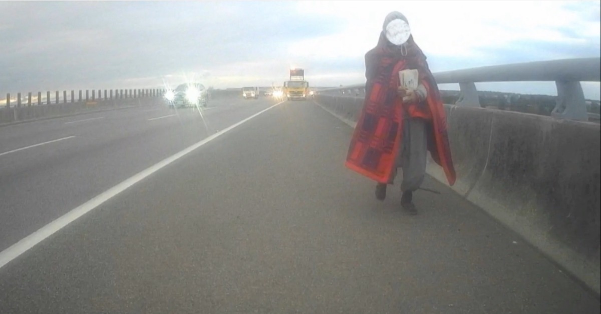 這麼冷的天氣裡,竟然有婦人披著一條紅色毛毯,闖進國道!有民眾在竹南交流道附近,目擊這名婦人冒著寒風大步走,甚至一度橫跨6個車道,危險走到對向,警方到場將人攔下。
