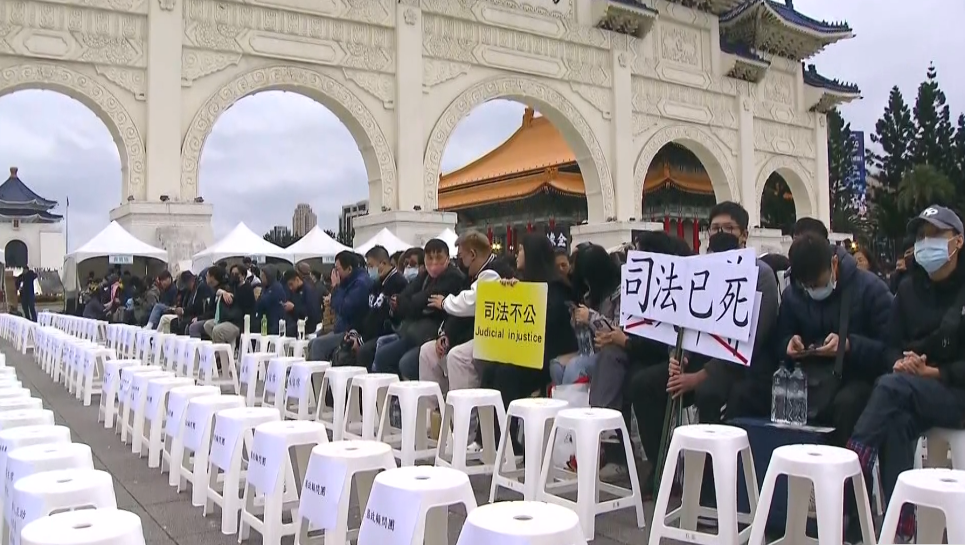 民眾黨號召民眾抗議司法不公舉辦「111釘孤枝」集會遊行,地點選在中正紀念堂自由廣場,截至下午1點半左右約200人到場,預計還會有越來越多民眾到場,事實上因為近期司法議題浮上檯面,很多民眾都對司法正義打上大大的問號,民眾黨因此號召民眾上街聲援,現場除了宣講的講台之外,也自組糾察隊觀察現場是否有違規情形,違規者將被請離現場。